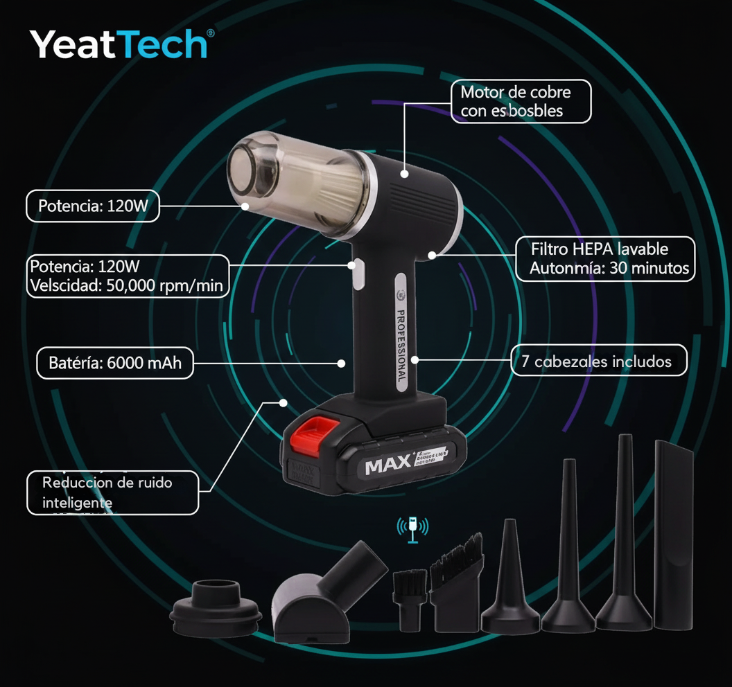 Aspiradora Portátil 120W con Motor de Cobre y 7 Cabezales
