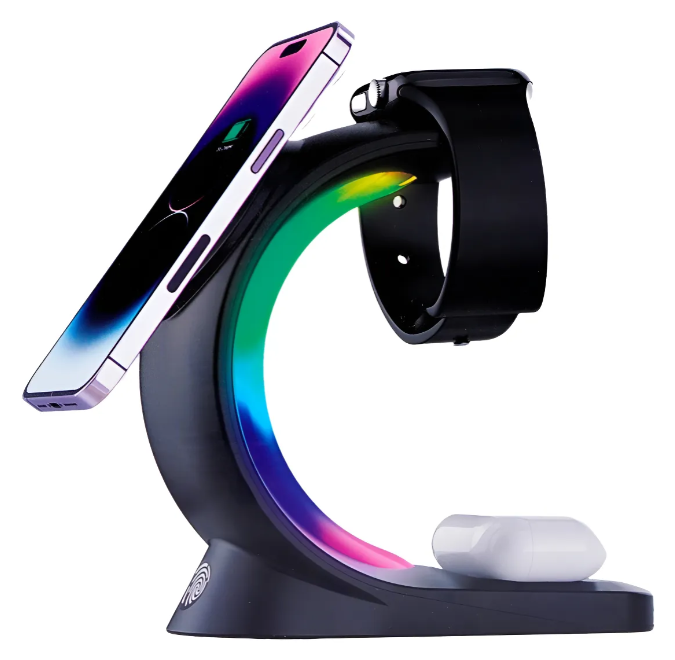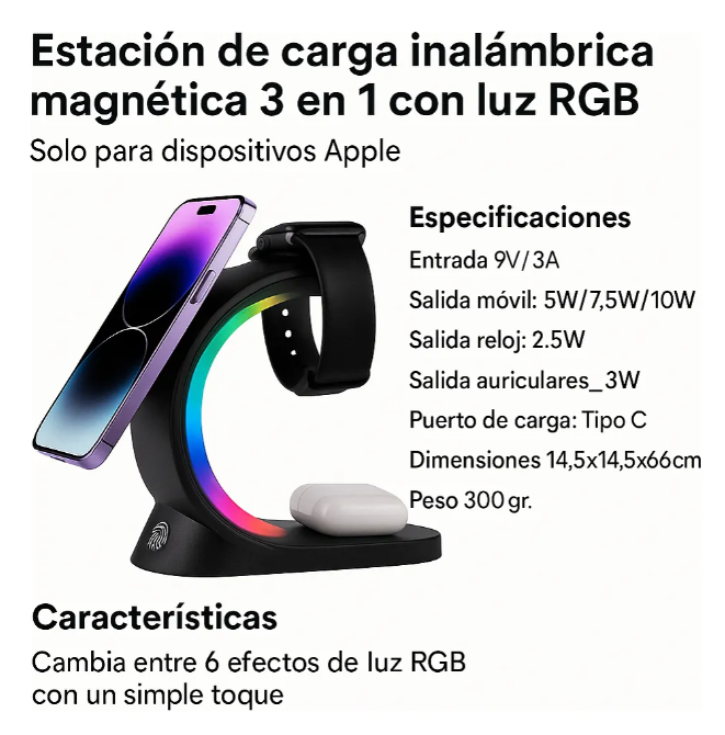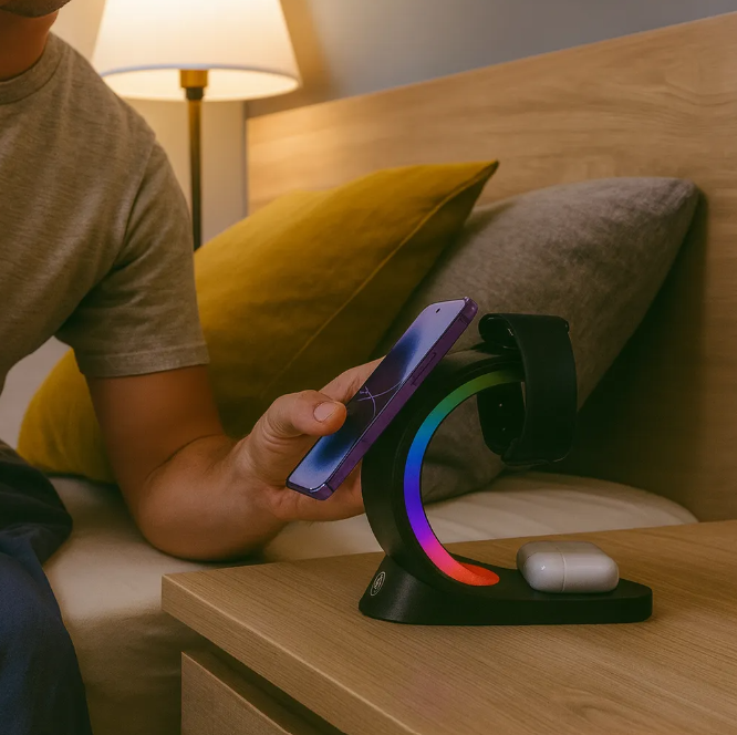 Imagina llegar a casa y colocar tu iPhone, tu Apple Watch y tus AirPods en un solo lugar, mientras una luz RGB ilumina suavemente tu espacio con tonos que se adaptan a tu estado de ánimo. Esta estación de carga 3 en 1 no es solo un accesorio, es el aliado perfecto para mantener tu día a día en orden, con diseño elegante y tecnología pensada para ti.